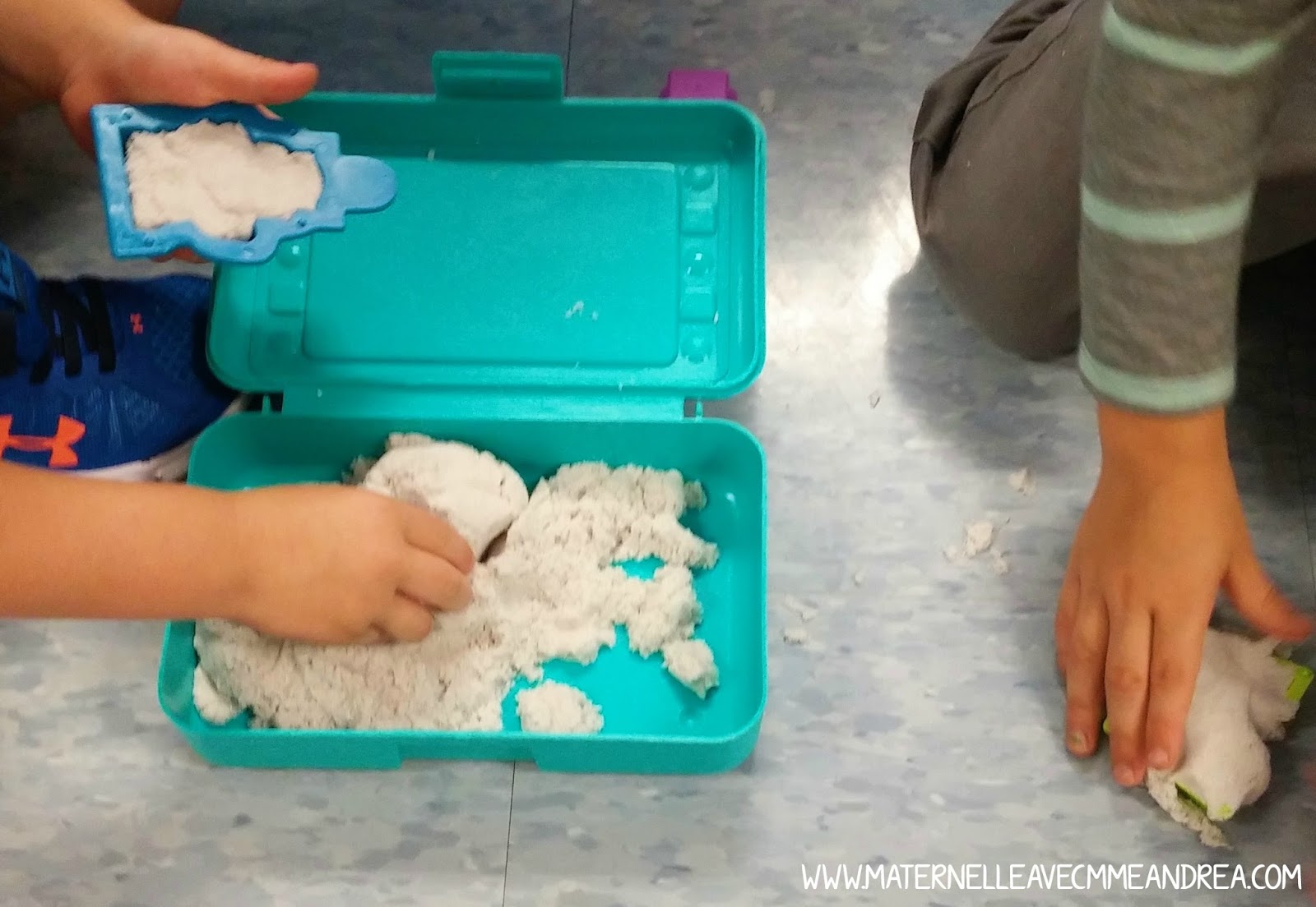 Kinetic sand! I bought two packs at Michaels (on two different days with two different coupons, haha), and two pencil boxes to store it in. I have a few molds and tools that they can use to manipulate it, and I have figured out that it is really smart to give them a cookie sheet to use to play on ;)