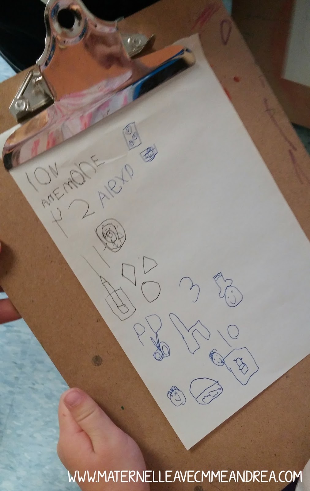 When I start Écris la salle, I start with letters. I tell them to either walk around looking for letters that they know, or I give them a target letter to find (if I give them a target letter, I put a flash card of that letter in the bin as well). Sometimes, they will write numbers or pictures that they see alongside the letters that they know – that’s fine in the beginning!