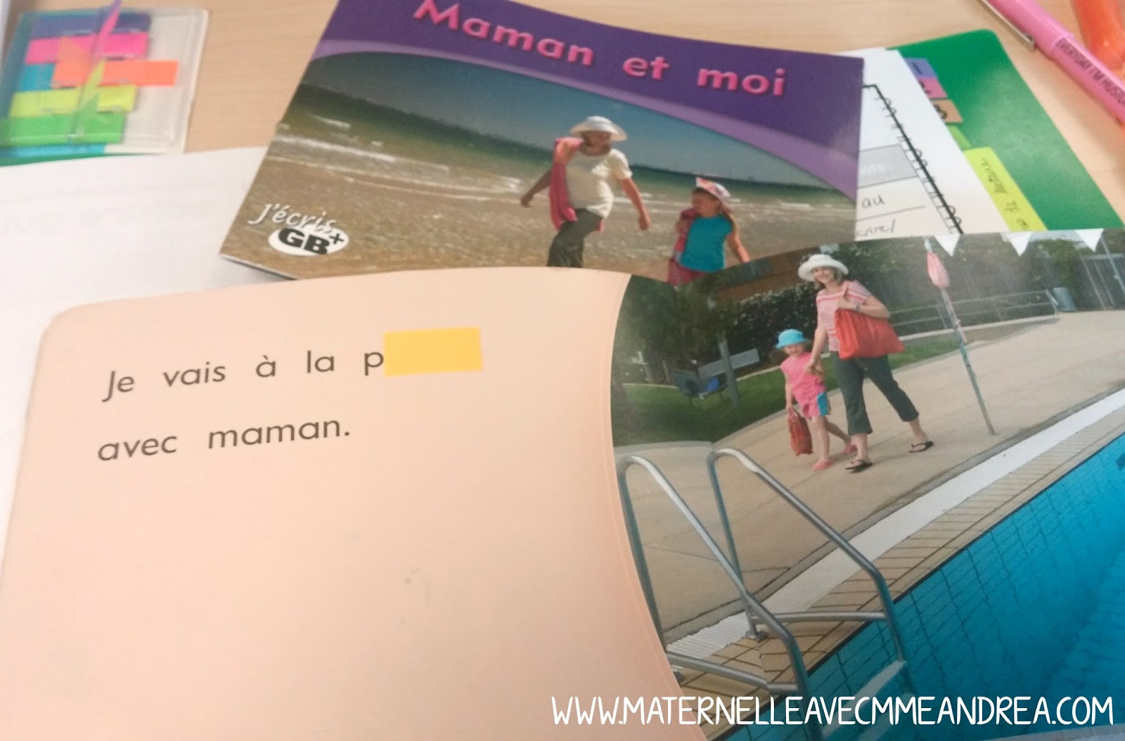 The book I chose for this particular group is a GB+ book called Moi et maman. It is a level 2 and has some difficult vocabulary, so I picked it for one of my groups that speaks French very well (I do consider oral abilities along with known letters/sight words and reading level when I am grouping my students). I knew there would be 1-2 brand new words to review/for them to learn, but the vast majority of the words they would already have in their mental vocabulary banks. I really wanted the focus of this lesson to be on looking at the first letter.